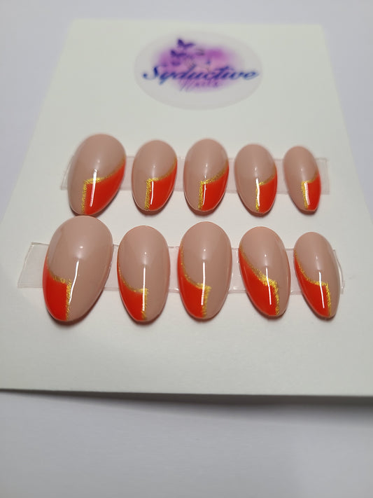 Orange half french nails with gold lines. Medium Almond, (16 pieces) Press-On Nails including Prep Kit (PN000053)