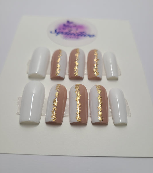 Glossy white and nude nails with gold flakes. Medium Square, (24 pieces) Press-On Nails including Prep Kit (PN000071)