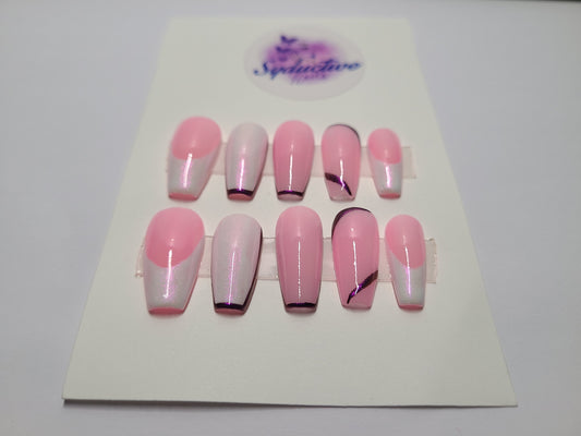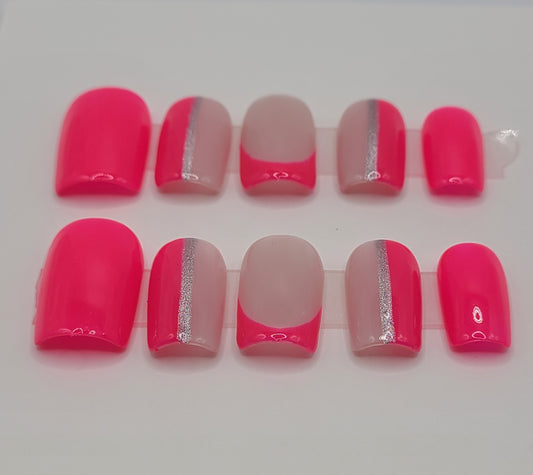 Bright pink multi-design with silver lines. Short Square, (10 pieces) Press-On Nails including Prep Kit