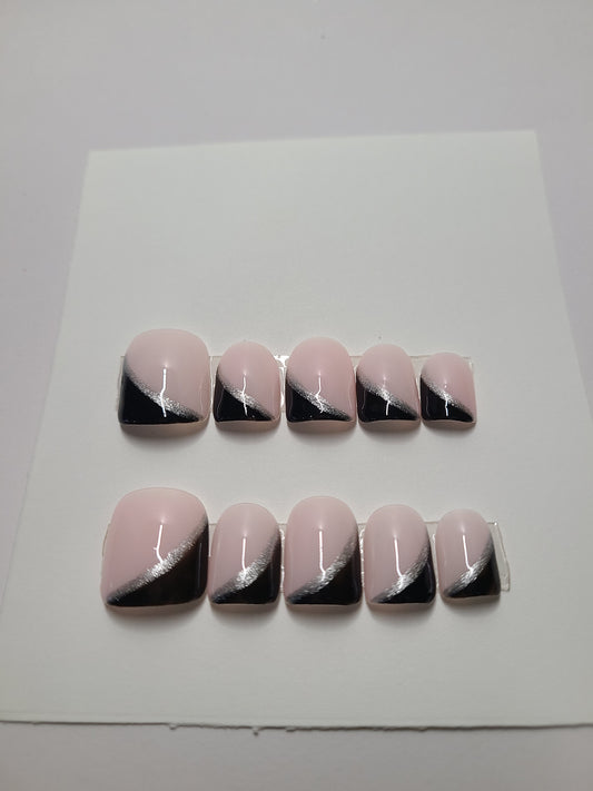 Black with silver lines. Short Square, (14 pieces) Press-On Nails including Prep Kit
