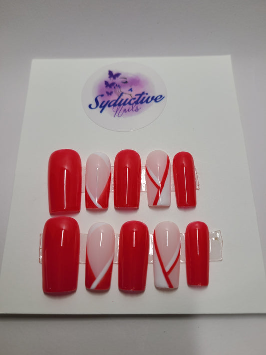 Red and White with geometric designs. Medium Square, (24 pieces) Press-On Nails including Prep Kit (PN000090)