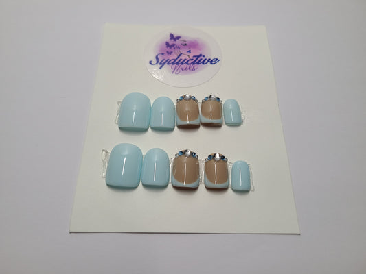 Pale blue French nails with gems on the middle and ring fingers. Short Square, (14 pieces) Press-On Nails including Prep Kit (PN000045)