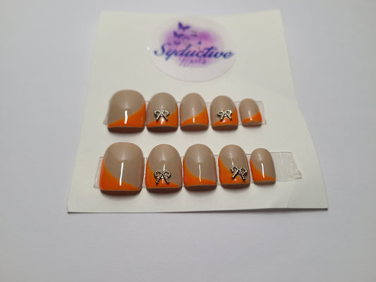 Orange and nude with gold gem bows on the index and ring fingers. Short Square, (14 pieces) Press-On Nails including Prep Kit (PN000044)