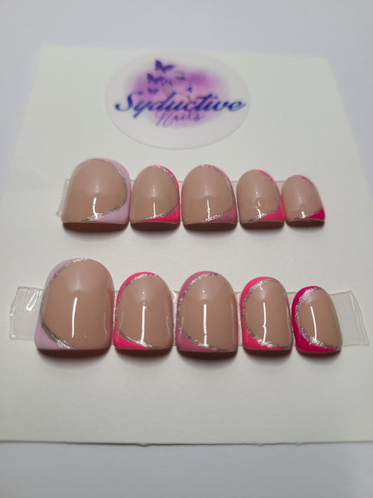 Shades of pink with silver lines. Short Square, (14 pieces) Press-On Nails including Prep Kit (PN000049)