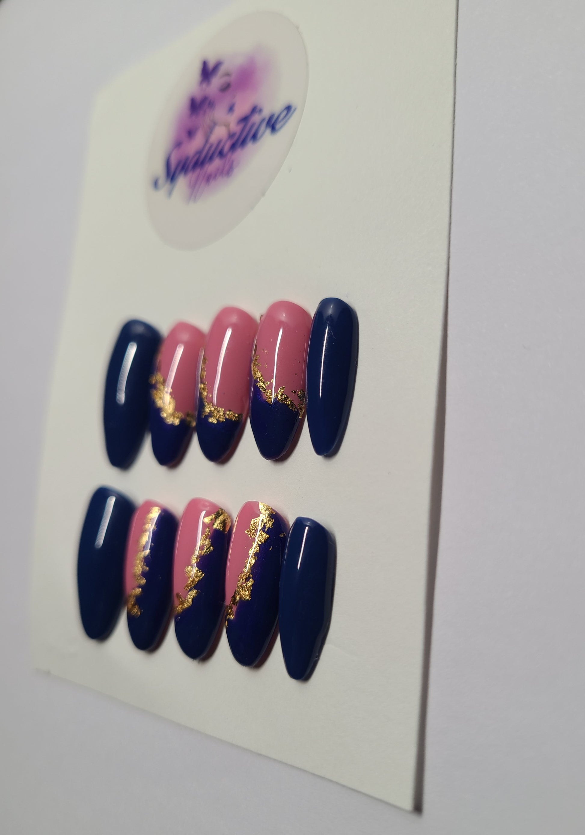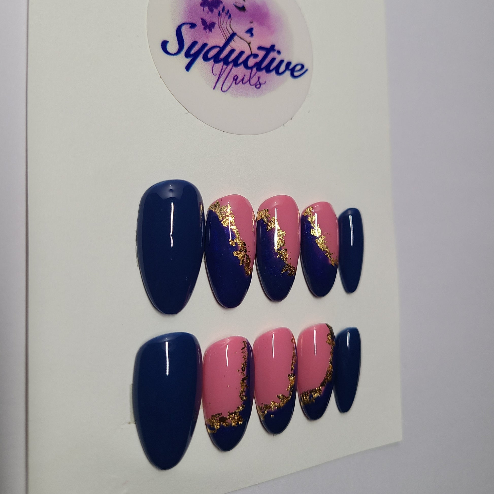 Dark blue and pink with gold flakes. Medium Almond, (14 pieces) Press-On Nails including Prep Kit (PN000057)