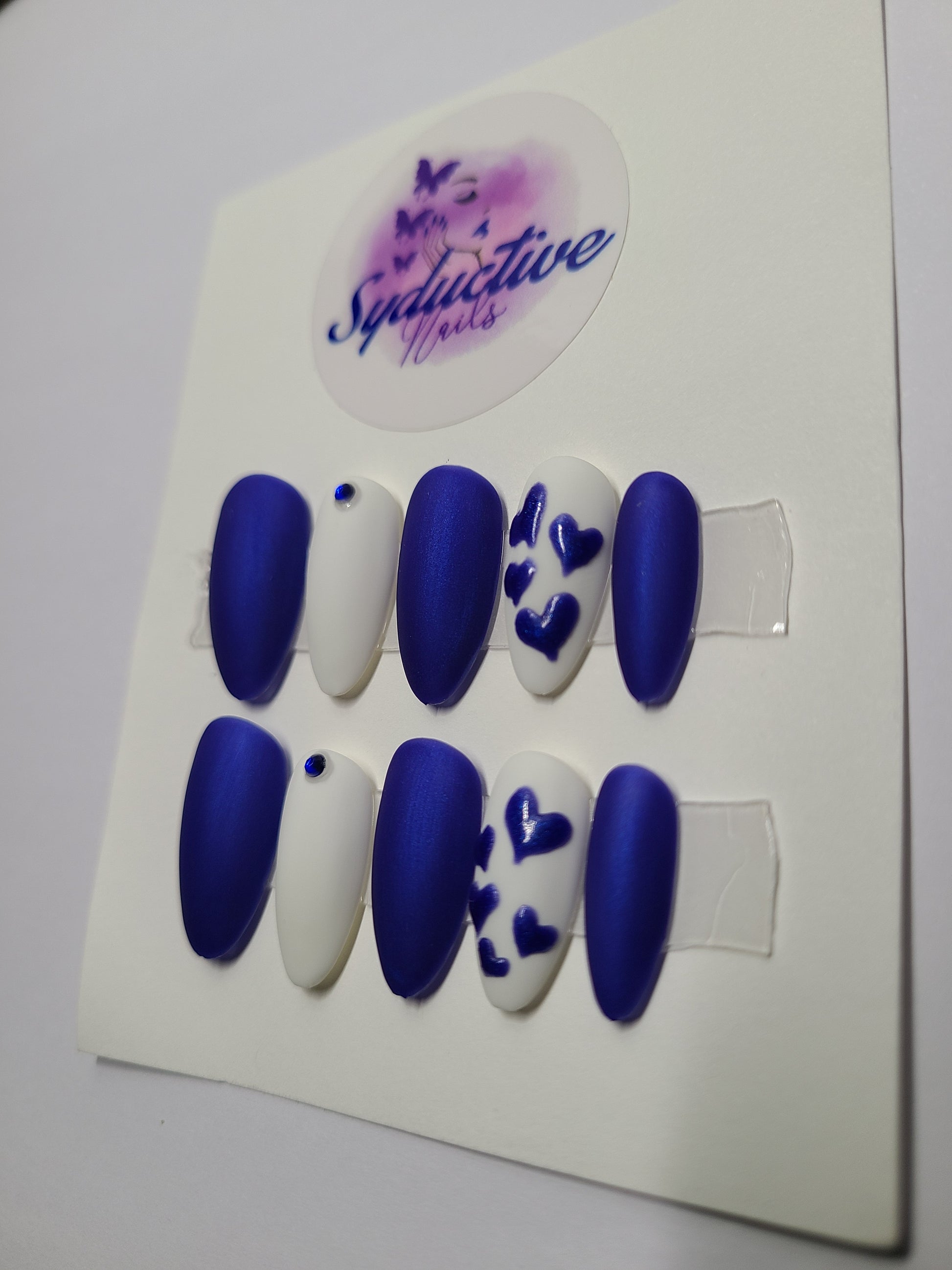Matte royal blue and white with blue hearts and gems. Medium Almond, (14 pieces) Press-On Nails including Prep Kit (PN000060)