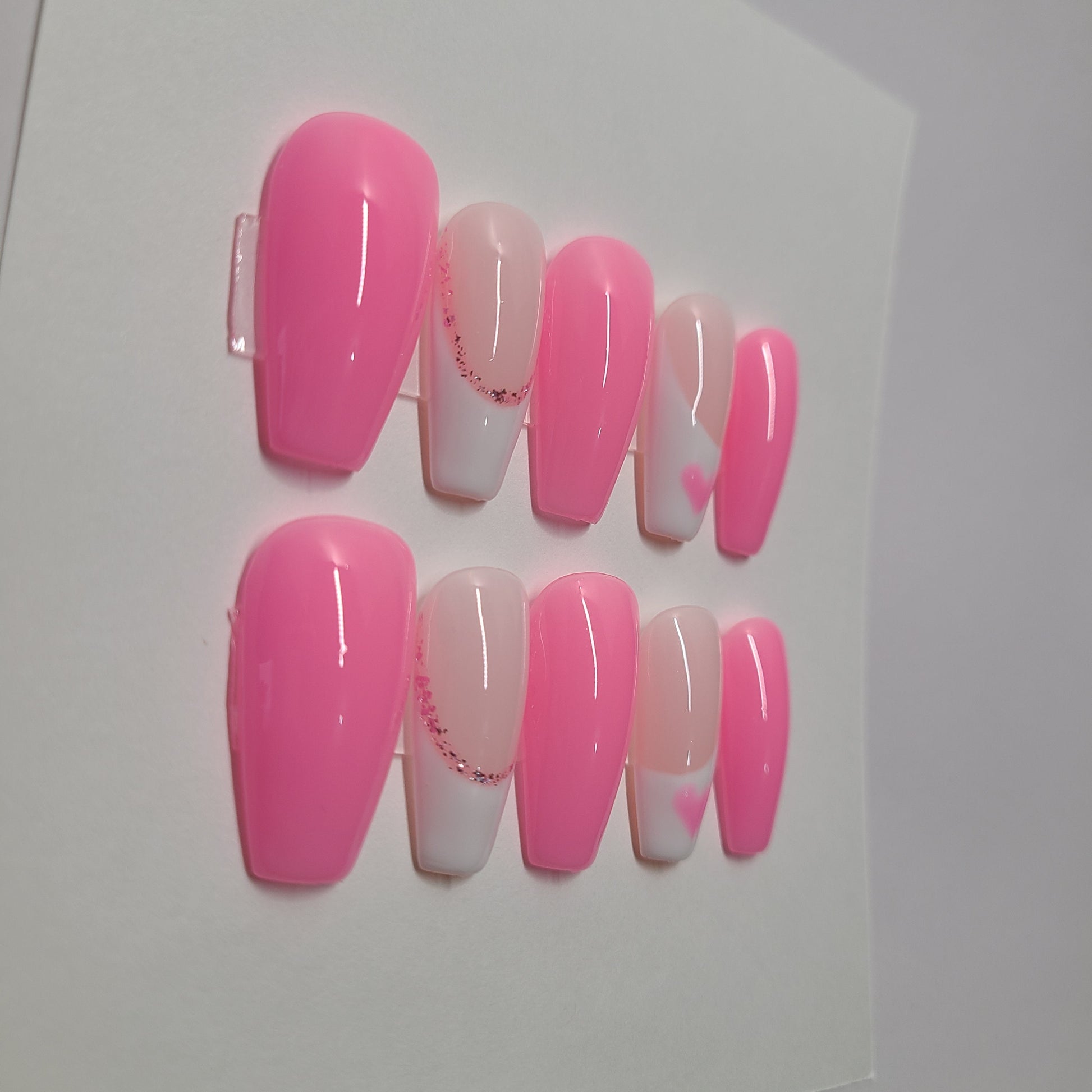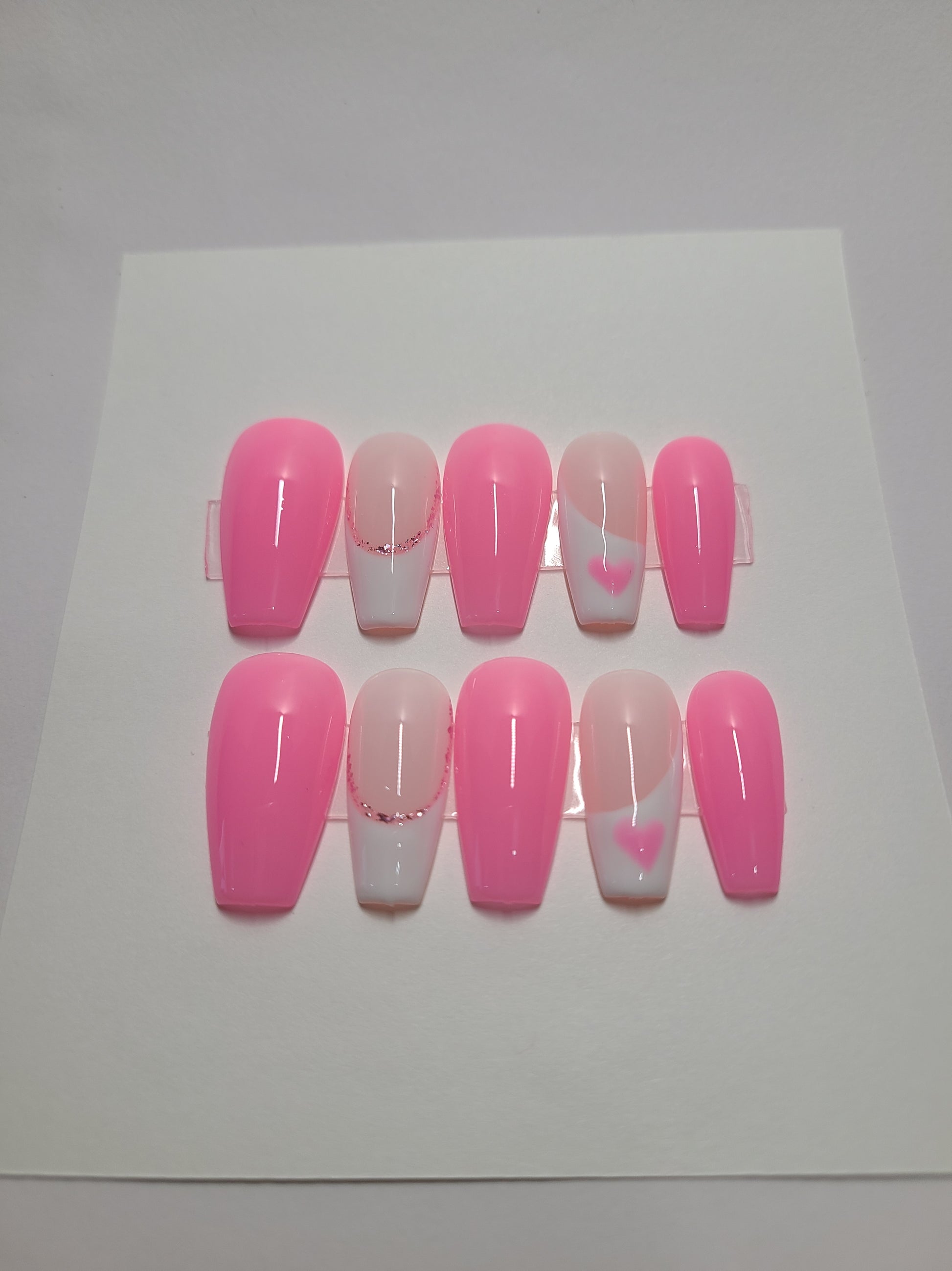 Pink and white multi-design with hearts. Medium Coffin,(20 pieces) Press-On Nails including Prep Kit (PN000085)