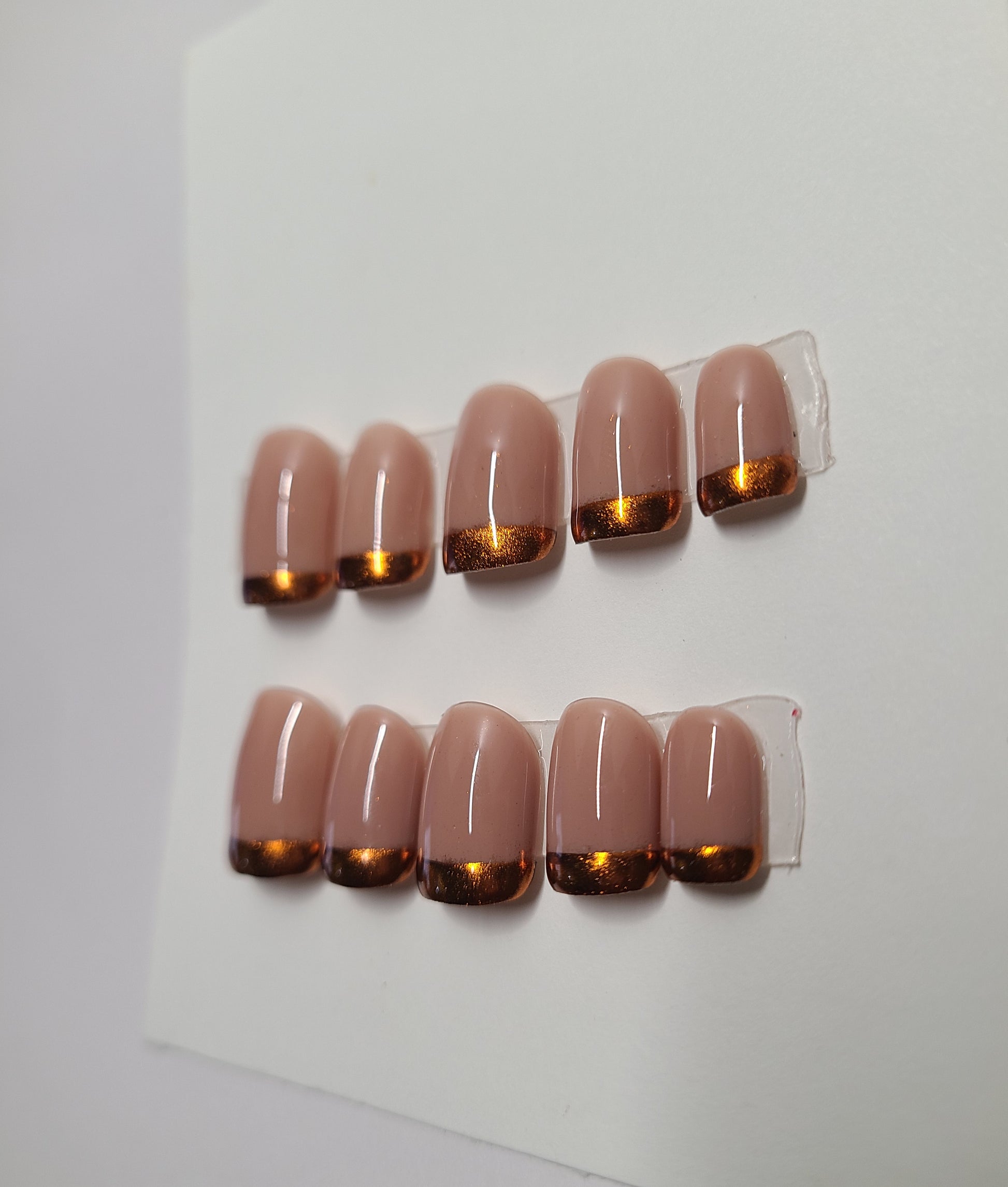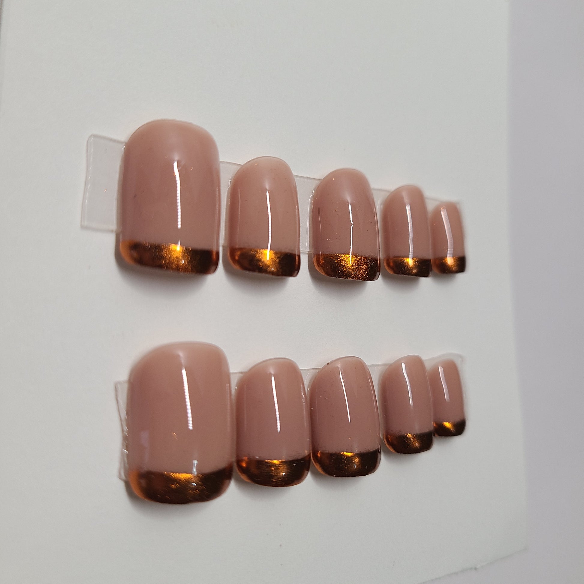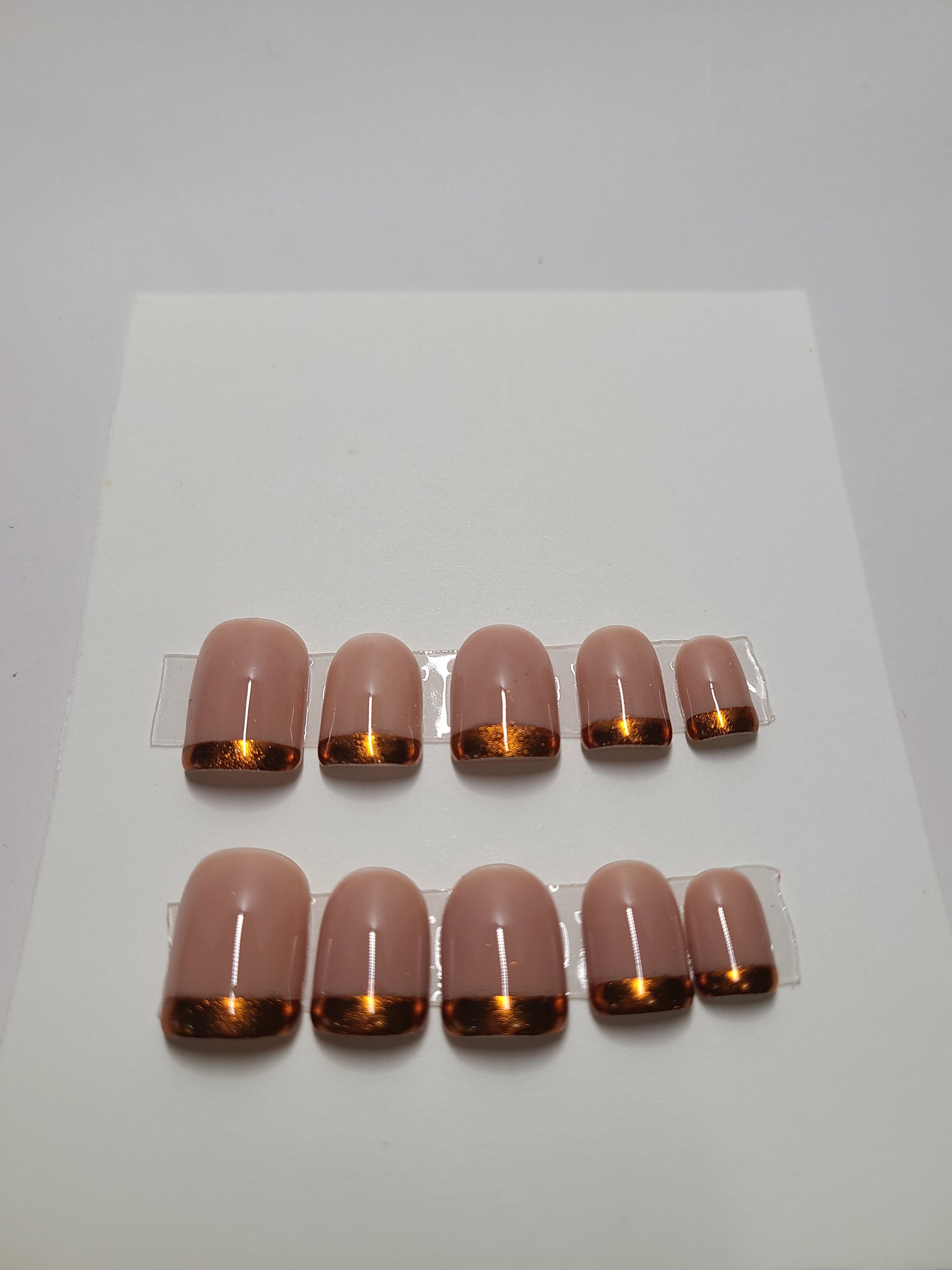 Nude with burnt orange chrome tips. Short square, (24 pieces) Press-On Nails including Prep Kit (PN000081)