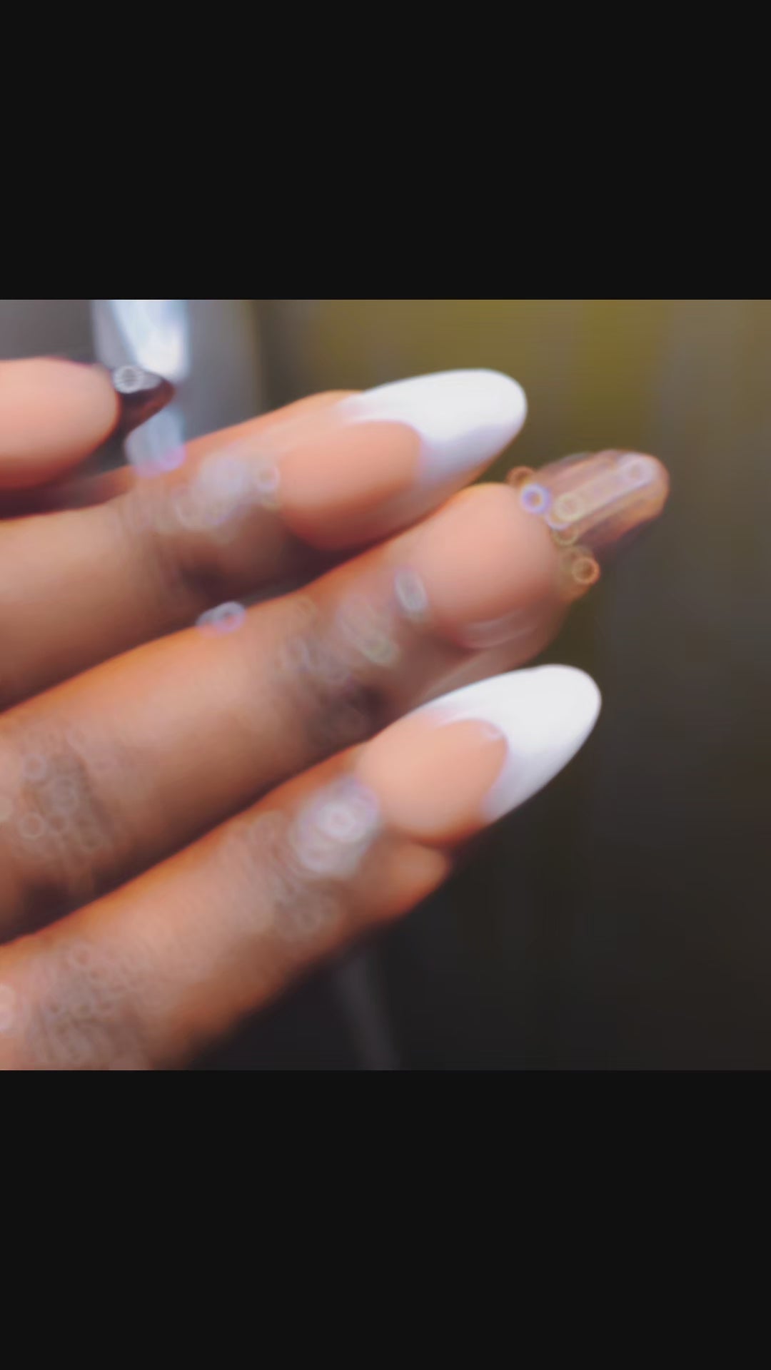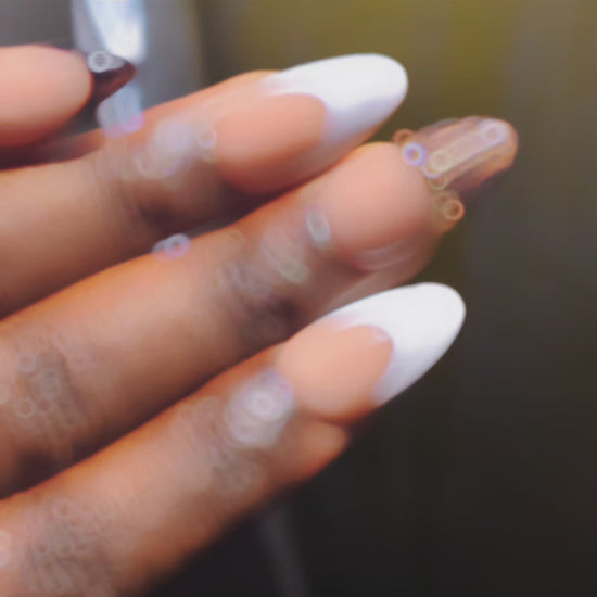 Bold meets refined with Savage Luxe, a striking medium almond set designed to turn heads. Featuring a nude base with a mix of brown cat-eye and crisp white French tips, this set is elevated by edgy black animal print accents. The middle finger steals the spotlight with a glass nail design, finished with gold beads and sparkling gems for a high-glam touch.