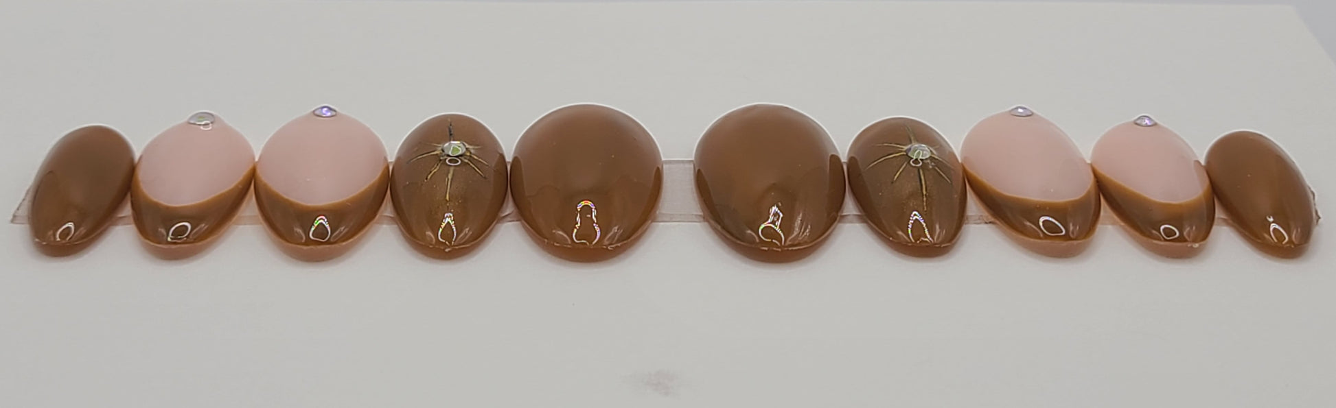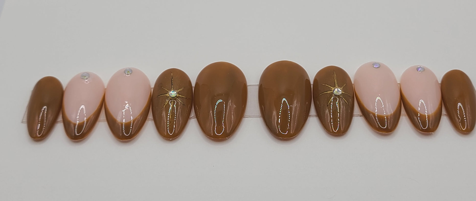 Bring the night sky to your fingertips with Golden Constellation. Brown nails shine with a gold chrome star and gem on the index finger, while the middle and ring nails feature French tips with gems at the cuticle. A chic mix of earthy tone and celestial sparkle.