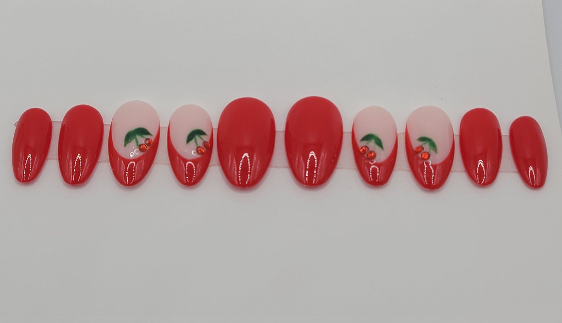 Bold and playful, Cherry Kiss features a full cherry-red finish on the thumb, ring, and pinky nails. The index and middle nails showcase red French tips with gem accents forming a sweet cherry design.