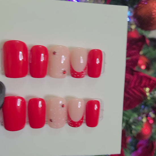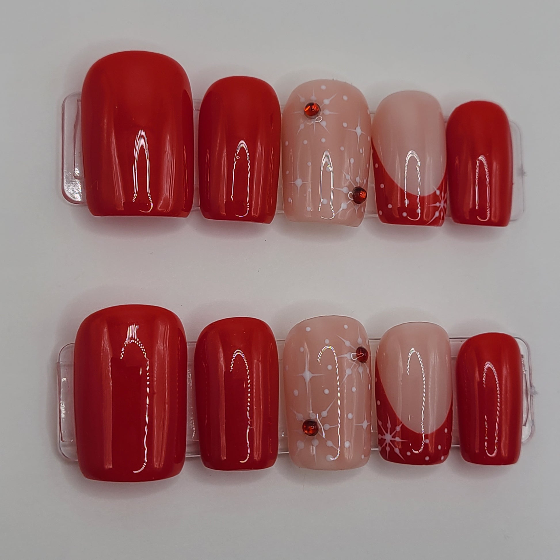 Experience holiday sophistication with this expertly curated nail collection. Featuring a harmonious mix of bold crimson and classic French tips on a short square silhouette, these press-on nails deliver seasonal impact with refined restraint. Intricate white snowflakes adorned with ruby-hued gemstone centers provide dimensional detail, while the neutral nude foundation ensures versatility across any festive ensemble. A masterfully balanced design that elevates your holiday aesthetic with understated elegance.