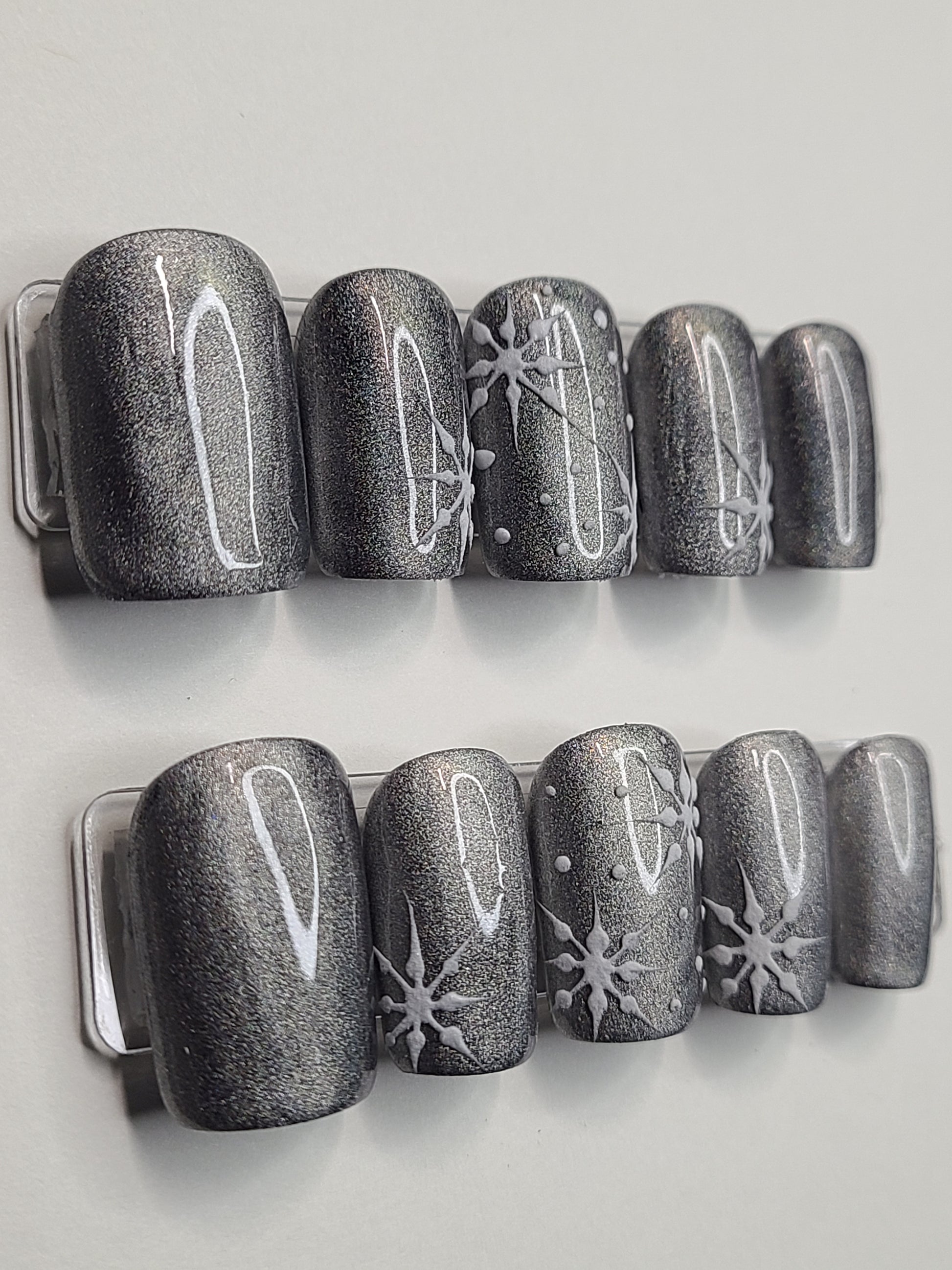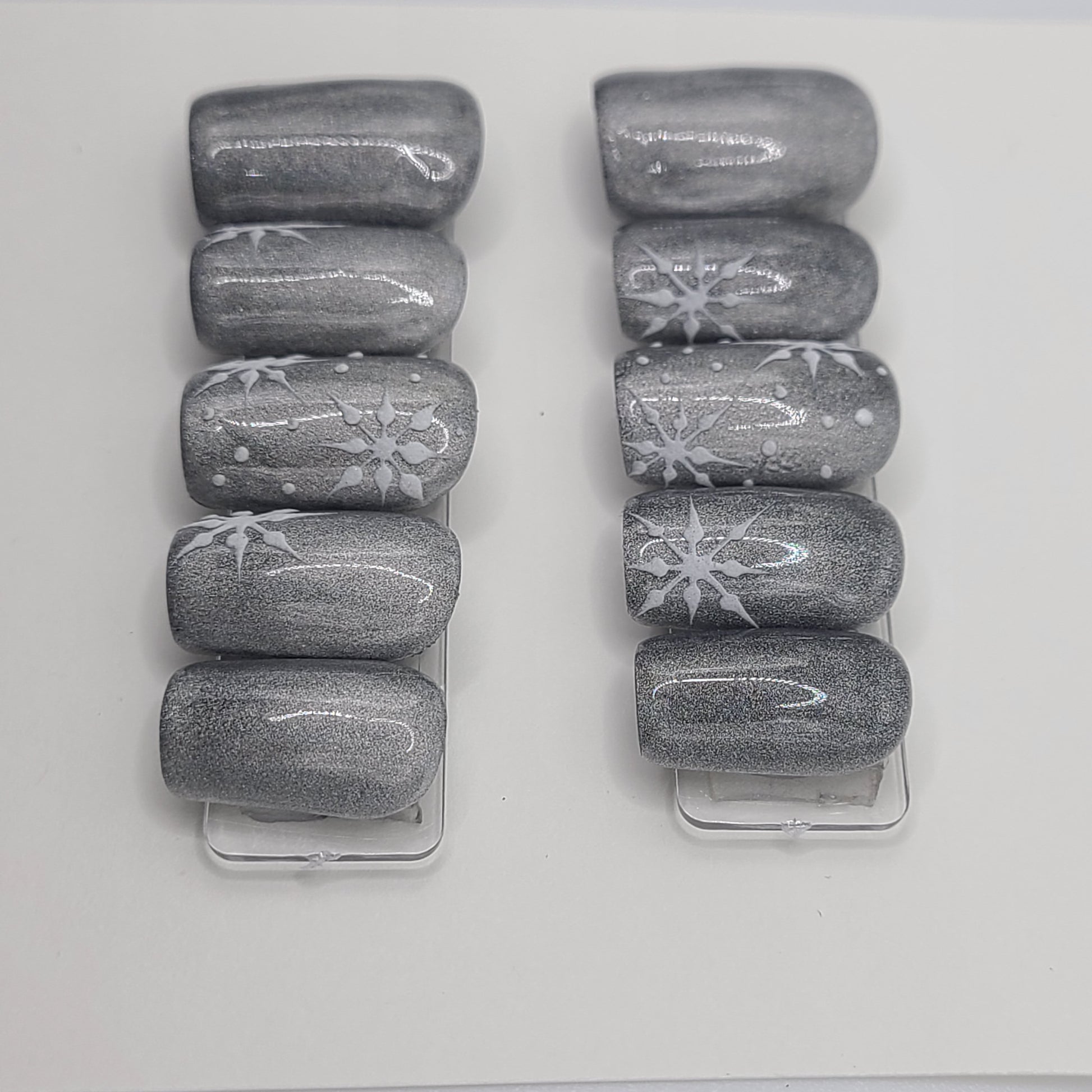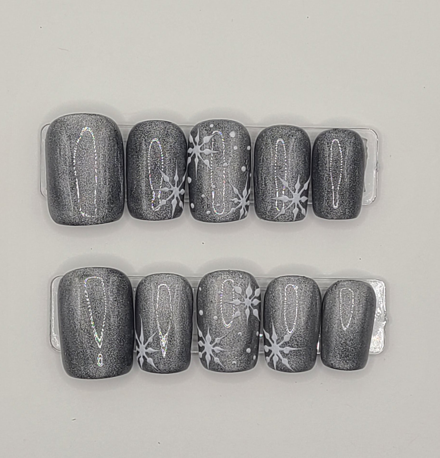 Experience instant sophistication with this expertly curated 10-piece press-on nail set. Featuring a classic short square silhouette, each nail showcases a brilliant silver chrome finish paired with intricate white snowflake accents that capture the essence of winter beauty. Designed for seamless application and superior longevity, this collection delivers professional-grade results while maintaining an elegant, seasonally-inspired aesthetic.