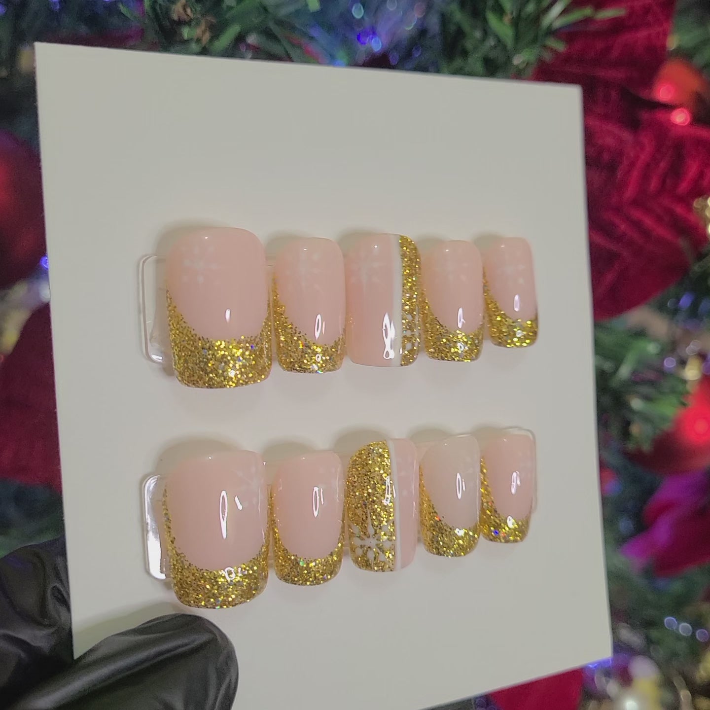 Embrace seasonal glamour with these professionally designed press-on nails that combine understated elegance with festive flair. Set against a soft pink base, luminous gold glitter French tips create a refined finish, while intricate snowflake motifs adorn each nail, adding visual interest. The middle finger showcases an exclusive split accent that elevates the overall design. The short square shape ensures a polished, contemporary look that complements any style preference during the holiday season and beyond.