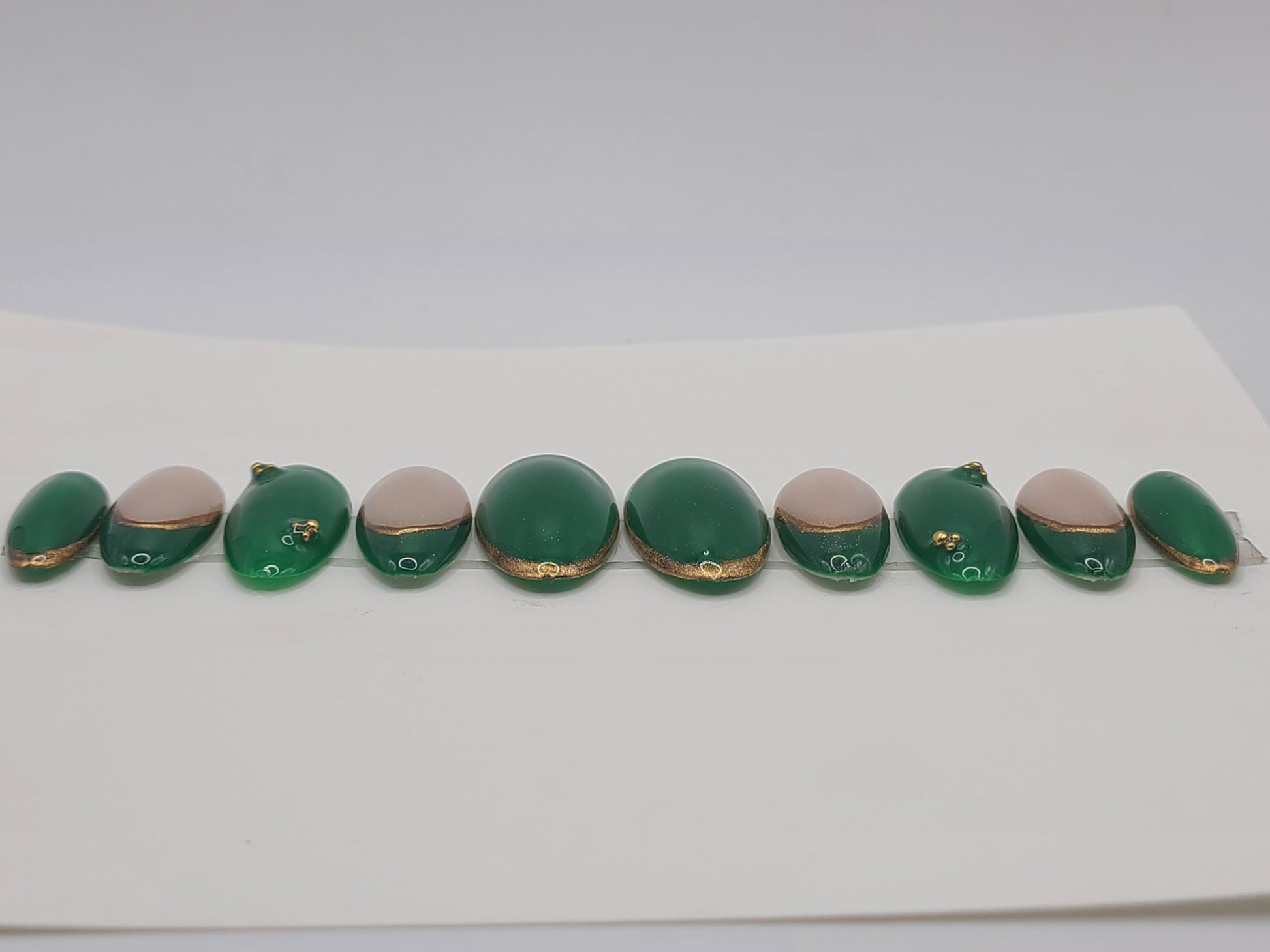 Rich and powerful, Emerald Luxe combines money-green nails outlined in gold chrome with pearl accents and gold beads. French tips with gold chrome smile lines add a polished, luxe finish.