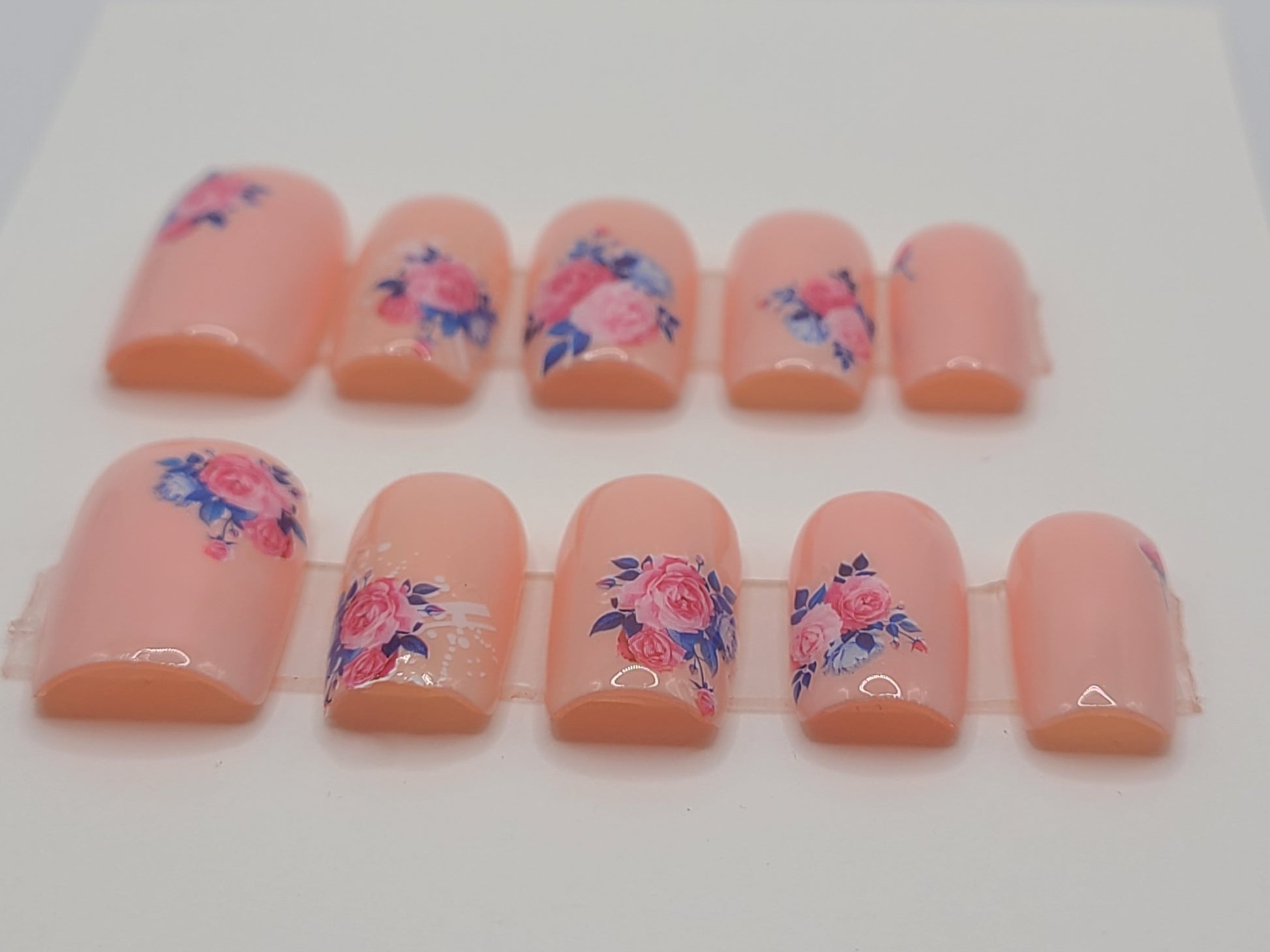 Soft and romantic, Petal Whispers features pink and blue floral accents atop a peachy-pink base. This short square set is perfect for anyone who loves delicate, refined beauty with a touch of playful charm.