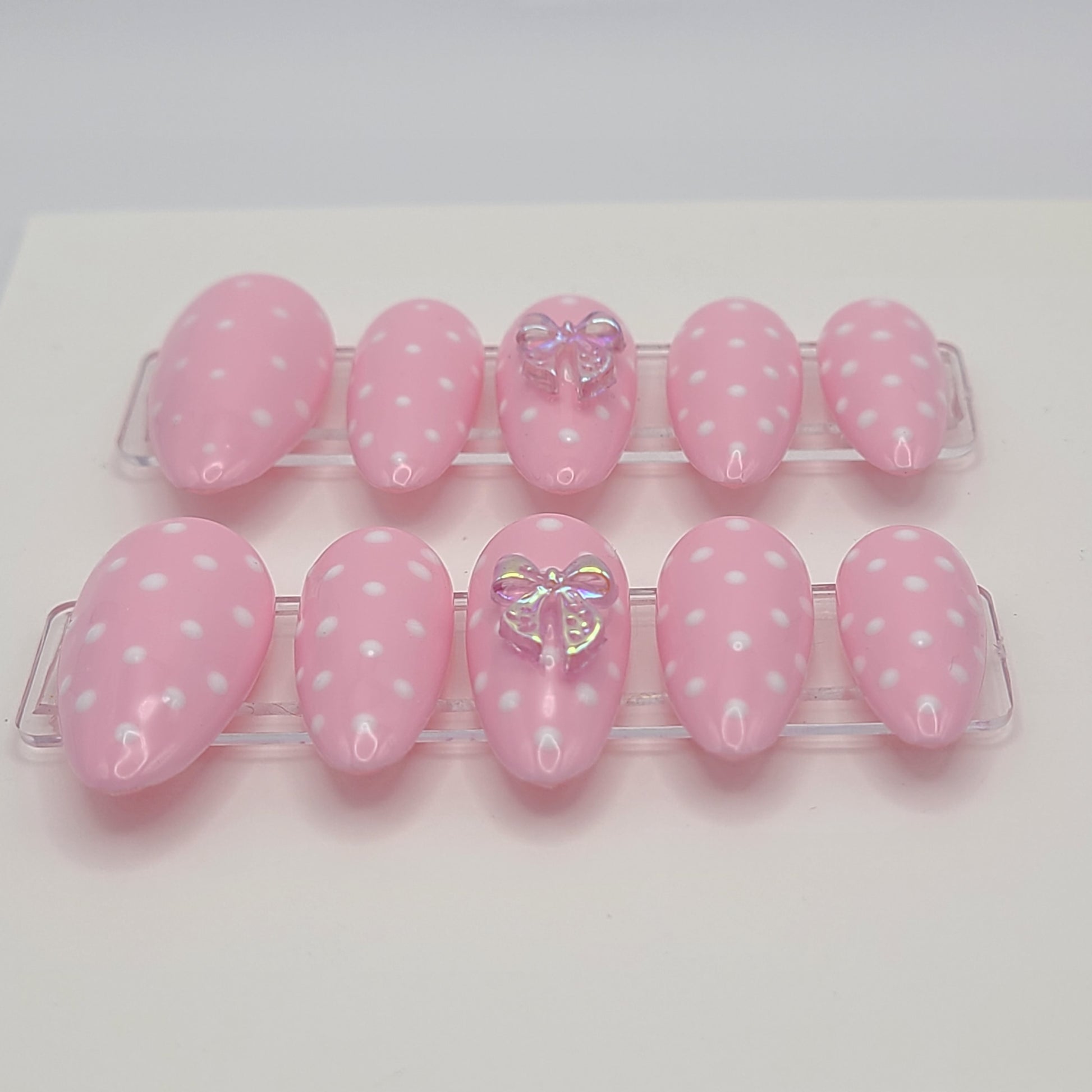 Soft, feminine, and delicately playful, Blush Ballet features a rosy pink base adorned with dainty white dot detailing. The middle finger steals the spotlight with a luminous iridescent bow that reflects soft pink hues, adding a romantic finishing touch to this elegant medium almond set.