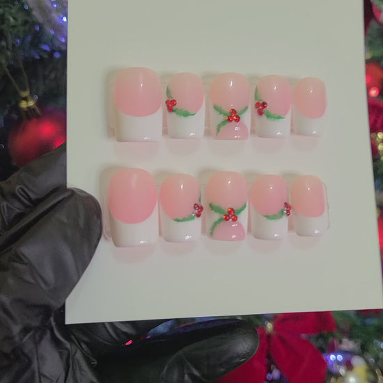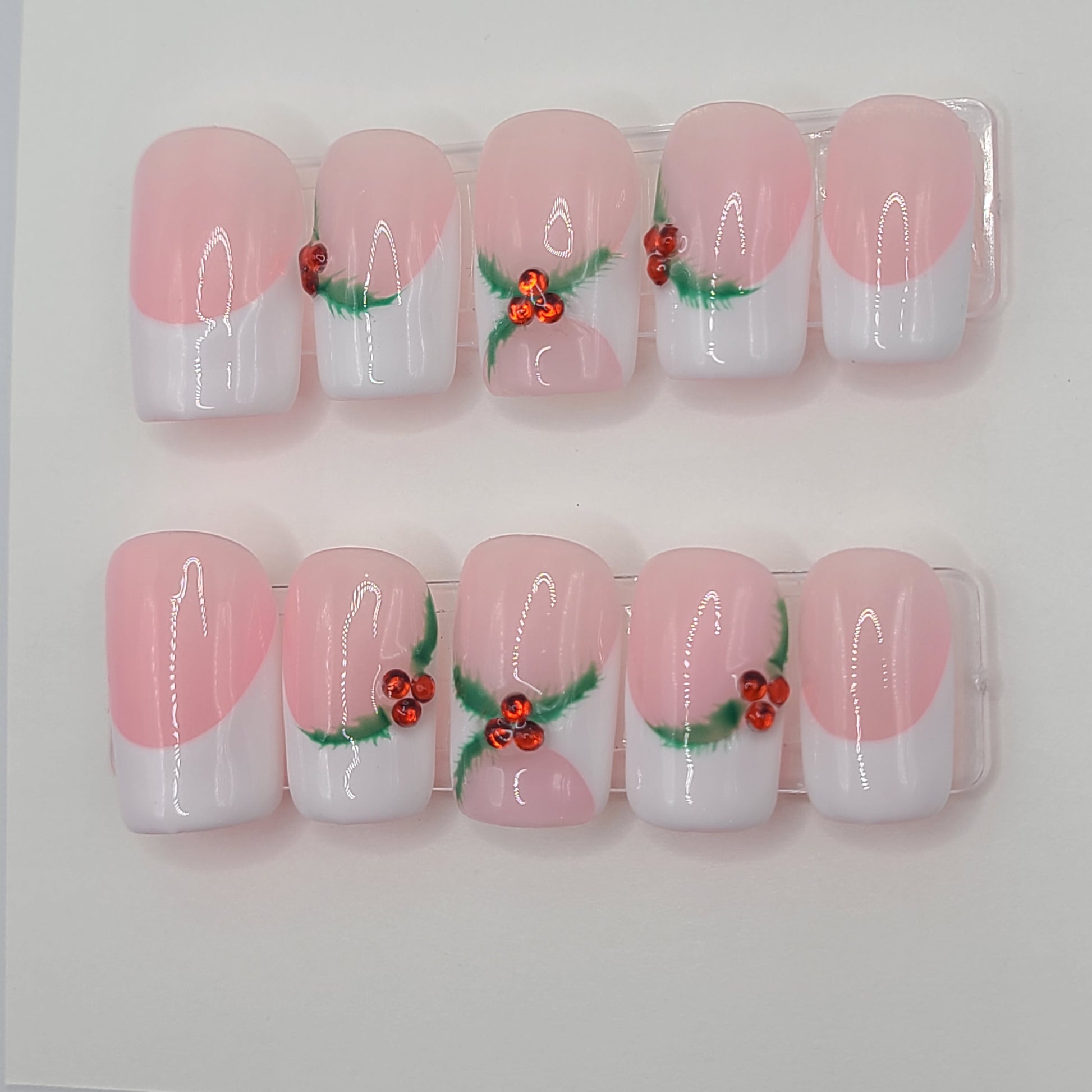Achieve polished holiday style with these expertly designed press-on nails. The collection pairs a clean white French manicure with tasteful mistletoe embellishments scattered across select nails, creating visual interest without overwhelming the design. A distinctive double reverse French detail on the middle finger adds architectural sophistication. Cut to a practical short square shape, these nails provide immediate wear and a professional finish, perfect for a modern aesthetic.